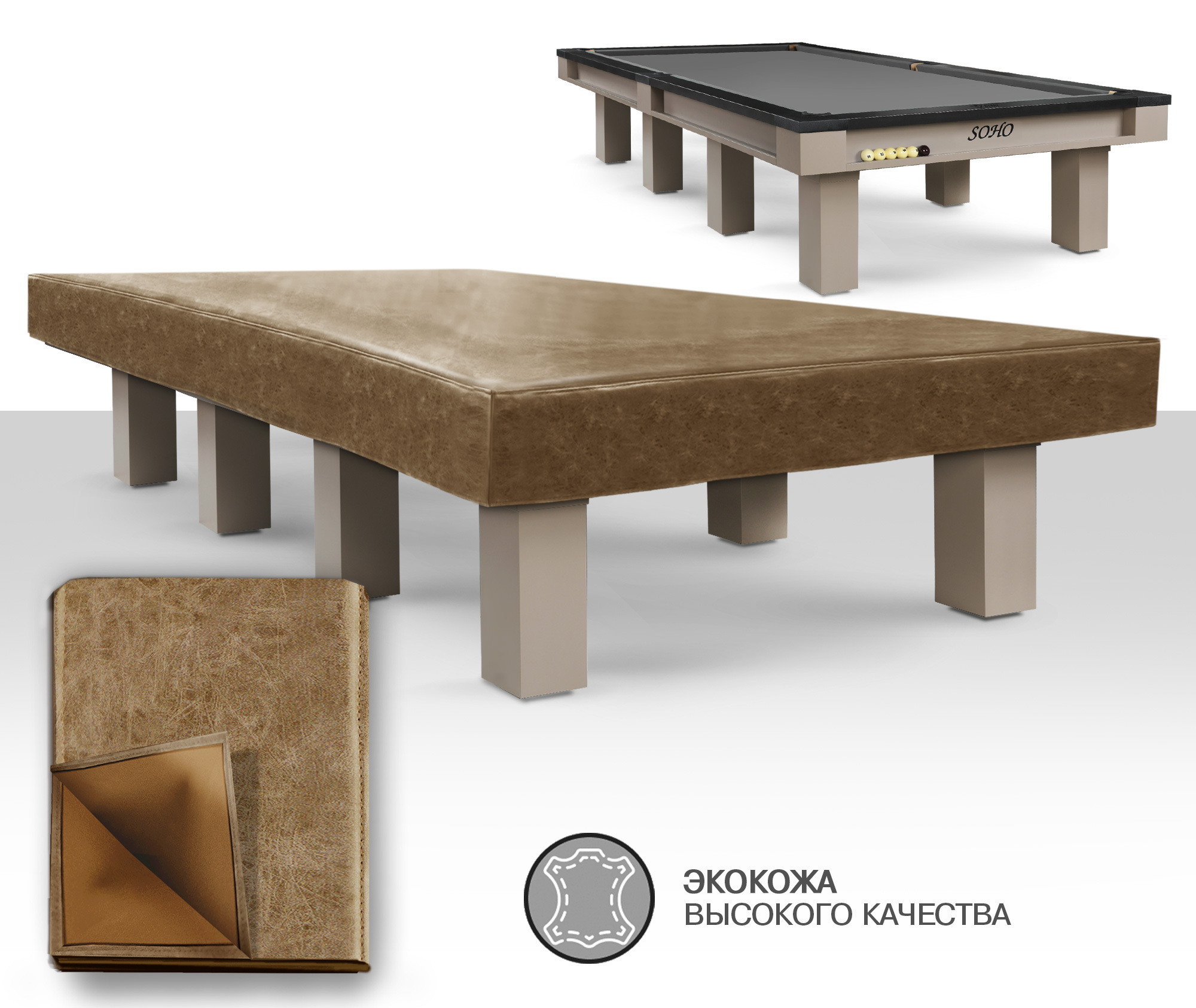 Чехол для бильярдных столов из плотной экокожи высокого качества обеспечивает надежную защиту от пыли, влаги, солнечного света и случайных царапин в перерывах между играми. Благодаря этому чехлу сукно не выгорает на солнце, и необходимость частой чистки поверхности стола от пыли значительно уменьшается. Это позволяет сукну сохранять свои свойства на более длительный срок. Чехол представляет собой идеальное сочетание стиля и функциональности. Специально разработанный для бильярдного стола SOHO чехол обеспечивает идеальную защиту поверхности, надежно закрывая борта и лузы. Также одним из главных достоинств данного чехла является его стильный и элегантный дизайн. Он способен подчеркнуть изысканный вкус владельца, добавляя нотку утонченности в обстановку. Чехлы представлены в двух классических цветах: бежевый и серый. Это универсальные цвета, которые легко впишутся в любой стиль интерьера. Такой чехол станет гармоничным дополнением к интерьеру любой бильярдной комнаты, создавая атмосферу уюта и роскоши. Материал чехла не требует особого ухода. Достаточно периодически аккуратно очищать от пыли влажной тканью, что делает его использование еще более удобным. Чехол станет незаменимым аксессуаром для любого владельца бильярдного стола, обеспечивая не только защиту, но и добавляя эстетическую привлекательность вашему игровому пространству.