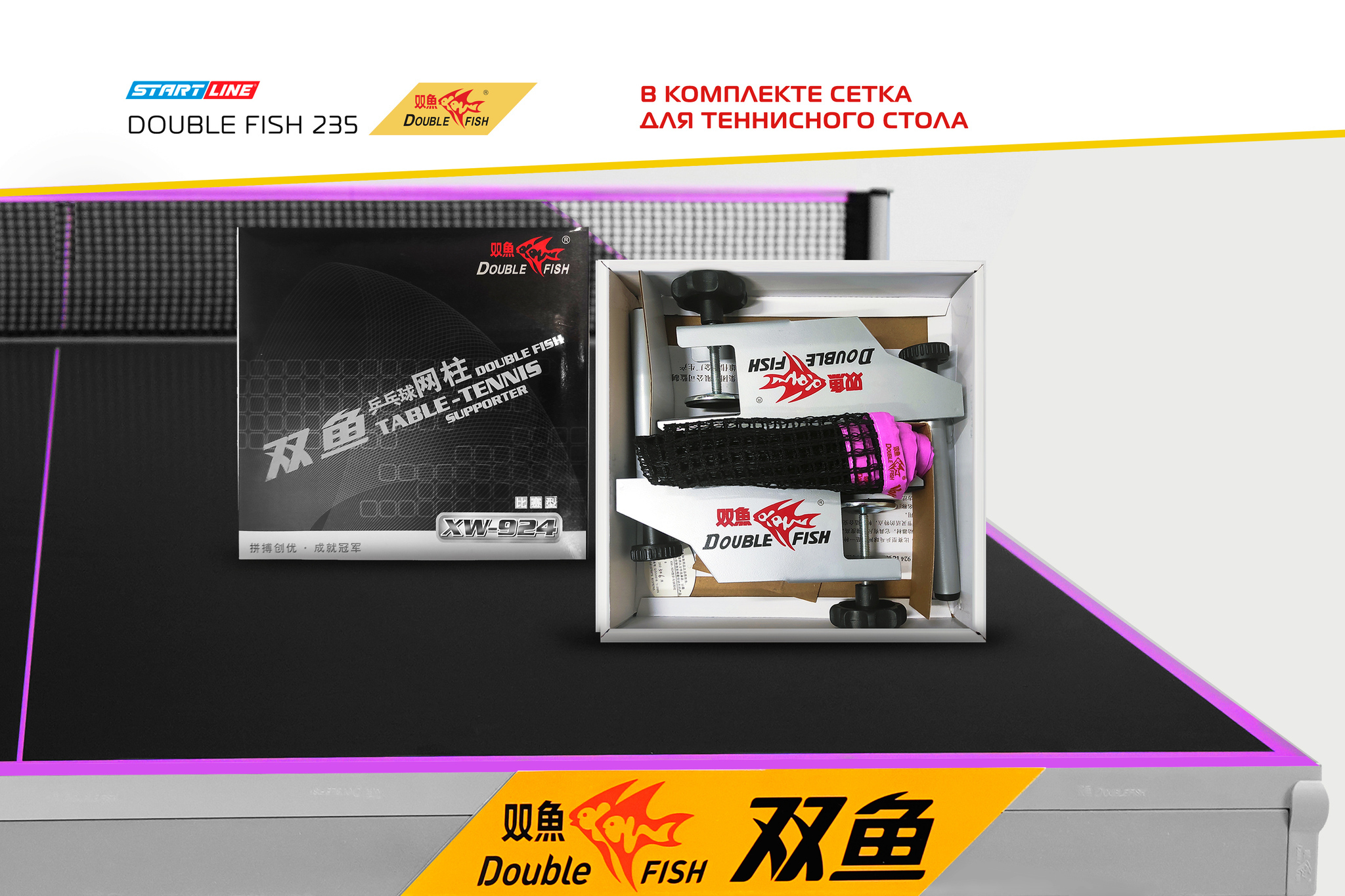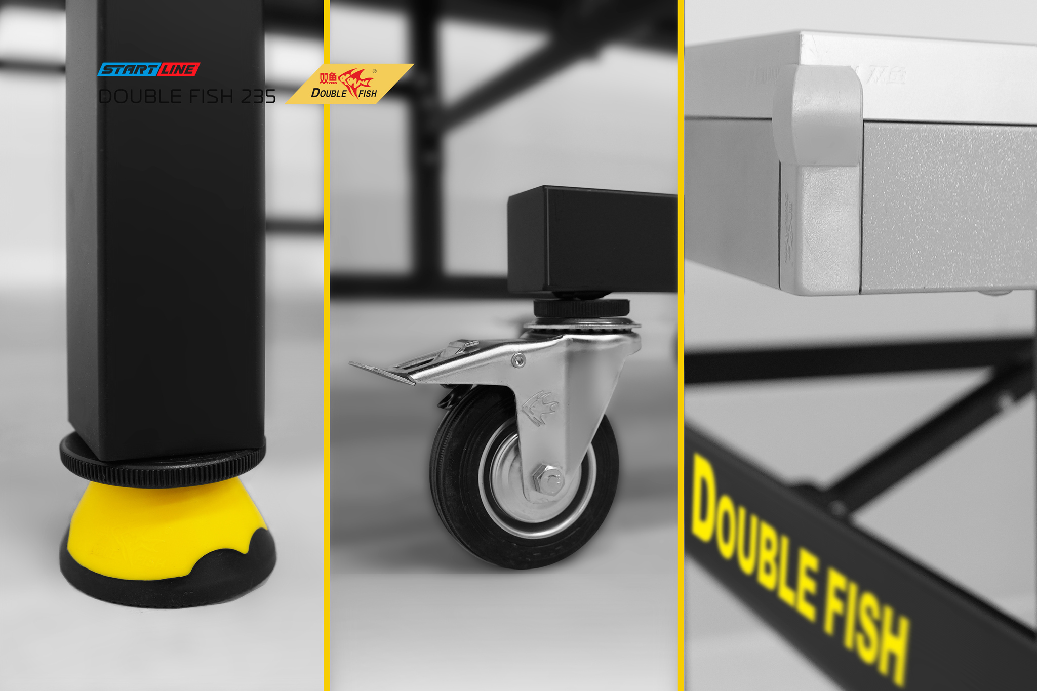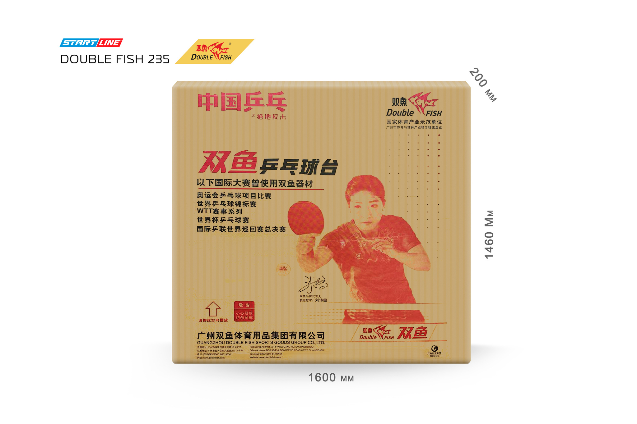Double Fish 235 представлен эксклюзивно Start Line на территории России и стран СНГ. Double Fish 235 – теннисный стол от ведущего производителя оборудования для настольного тенниса. Крепкое сотрудничество Start Line и Double Fish позволило сегодня представить эту уникальную модель на российском рынке и среди стран СНГ. Размеры теннисного стола в рабочем положении соответствуют стандарту ITTF: 274 см в длину, 152,5 см в ширину, 76 см в высоту. Столешница выполнена из МДФ толщиной 25 мм с многослойной покраской. Такая комбинация материалов не только защищает стол от повреждений и трещин, но и гарантирует предсказуемый отскок до 23 см при броске с высоты 30 см. По периметру столешница обрамлена кантом 50х20 мм, который придает игровому полю дополнительную жёсткость и стабильность во время игры, а также защищает края от механического воздействия. Легкая и удобная настройка рабочей позиции теннисного стола обеспечивается при помощи регулировки высоты стальных боковых опор и восьми поворотных колес. Надежная фиксация всех точек опоры позволяет выставить строго горизонтальный уровень стола на любой поверхности. Модель обладает исключительной устойчивостью и прочностью. Восемь обрезиненных маневренных транспортировочных колес диаметром 100 мм обеспечивают легкость перемещения стола. Колеса оснащены стопорами, которые задают жесткую фиксацию нужного положения и стабильность стола во время игры. Теннисный стол Double Fish 235 отличает комфортная и безопасная система складывания. Модель в сложенном виде очень компактна, что дает важные эксплуатационные преимущества: минимум места в положении хранения и удобство манипуляций при транспортировке. Уникальная конструкция позволяет установить стол в положение PlayBack для одиночной игры. Теннисный стол Double Fish 235 не требует сборки. Модель поставляется в собранном виде, необходим только монтаж опор и транспортировочных колес. Стильный и лаконичный дизайн теннисного стола является еще одним преимуществом модели Double Fish 235. Важно, что в комплекте со столом идет профессиональный набор аксессуаров для настольного тенниса. В набор входят сетка XW-924 для теннисного стола, две ракеткиnbsp;nbsp;J8 c накладками ITTF в чехлах, а также мячи 6 шт 3* и 10 шт 1*. Теннисный стол Double Fish 235 - воплощение качества и стиля в индустрии профессионального тенниса, идеальное решение для оснащения спортивных клубов и тренировочных залов.nbsp;nbsp;
