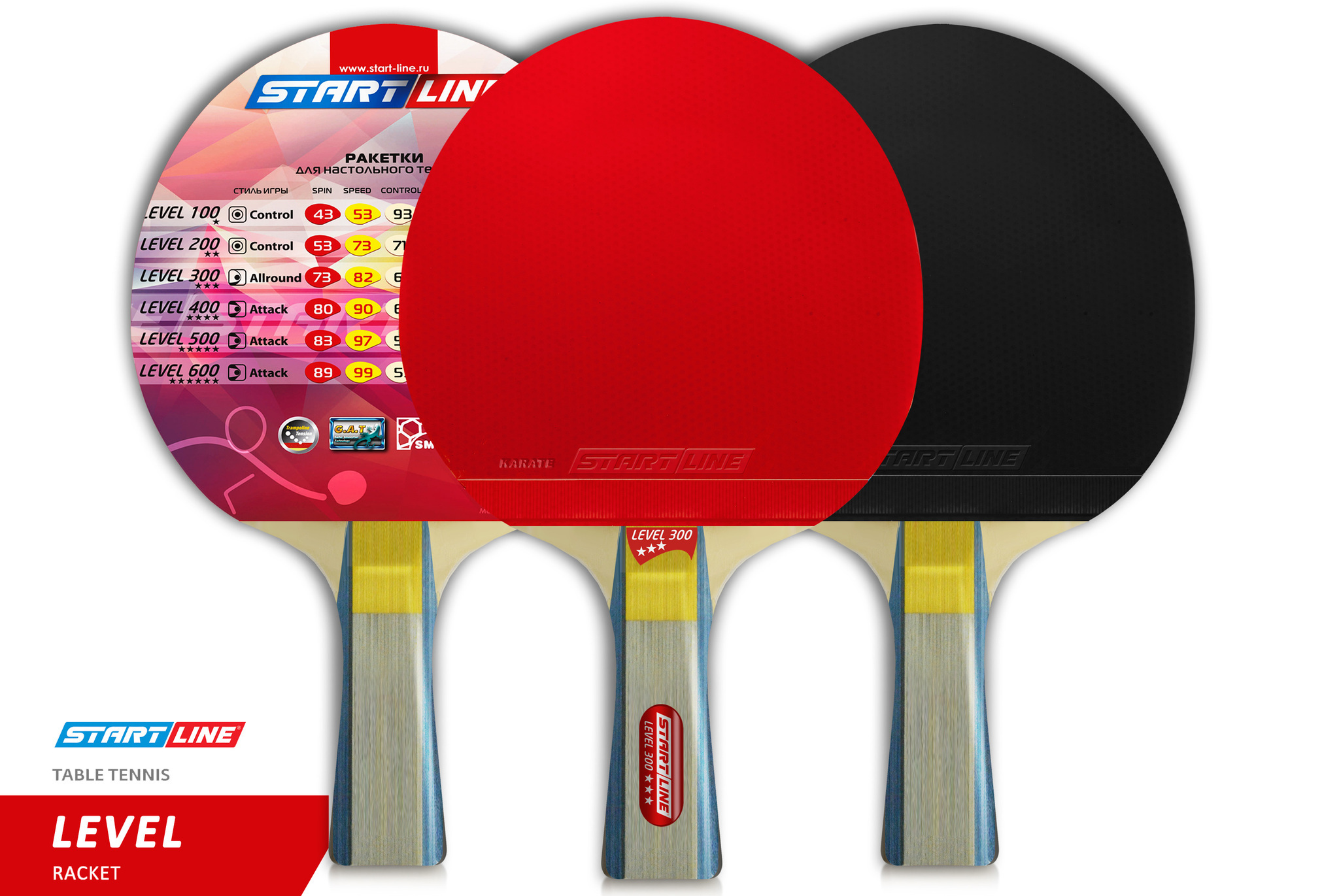 Ракетка для настольного тенниса Level 300 соответствует высокому современному стандарту качества, имеет обновленный дизайн, а также улучшенные технологические и игровые характеристики. В производстве ракеток Level 300 применены новейшие технологии: - Технология натяжения - Trampoline Tension Technology Уникальная технология, которая делает резину и губку с высоким натяжением. При игре резина хорошо поглощает атакующие удары мячей. Данный вид резины содержит натуральные органические вещества. - Технология поглощения - Gecko Adsorption Technology Эту технологию применяют при производстве резиновой поверхности ракетки. Так, на самой поверхности резины образуется множество выходных отверстие #40;как губка#41;, которые позволяют задержать мячи на резине. Благодаря этой технологии можно свободно контролировать мяч, его скорость и вращение. - Технология симметрии - Symmetrical Microcellular Foam Technology. Благодаряnbsp;nbsp;применению симметричного мелкопористого пенопласта, ракетка отличается эластичностью, легкостью и хорошим энергопоглощением.