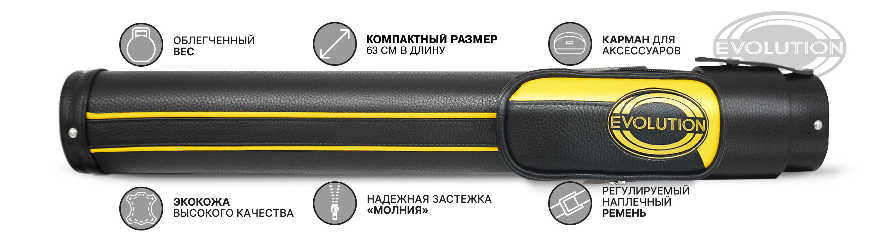 Тубус EVOLUTION CLUB предназначен для безопасного хранения и транспортировки одного трехсоставного кия. Жесткий корпус надежно защитит кий от повреждений и влаги, а яркий дизайн станет стильным дополнением образа спортсмена. Отличительной особенностью данной модели является его миниатюрный размер - в длину тубус всего лишь - 65 см. Секция для хранения кия разделена на три части мягкой перегородкой, защищающей инструмент от каких-либо повреждений. На тубусе имеется вместительный карман с застежкой молния для бильярдных аксессуаров и эргономичная ручка и регулируемый наплечный ремень для удобно транспортировки. Тубус выполнен из высококачественной износостойкой экокожи в двухцветной комбинации.